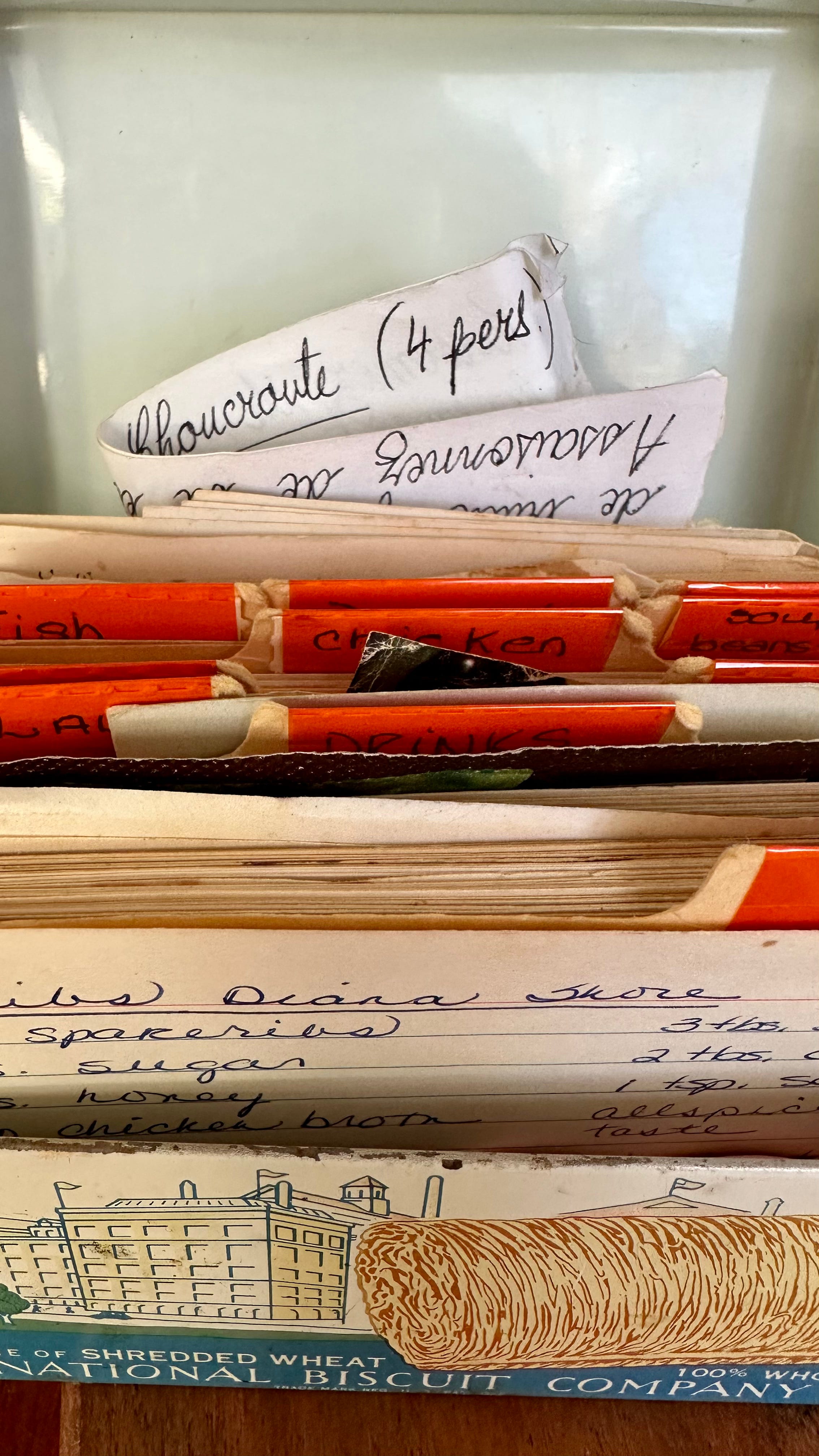 Some people write diaries. I write recipe cards. I do it to preserve a recipe to try later, to remember people or meals, and flipping back through them is much like reading a diary if I had written one.